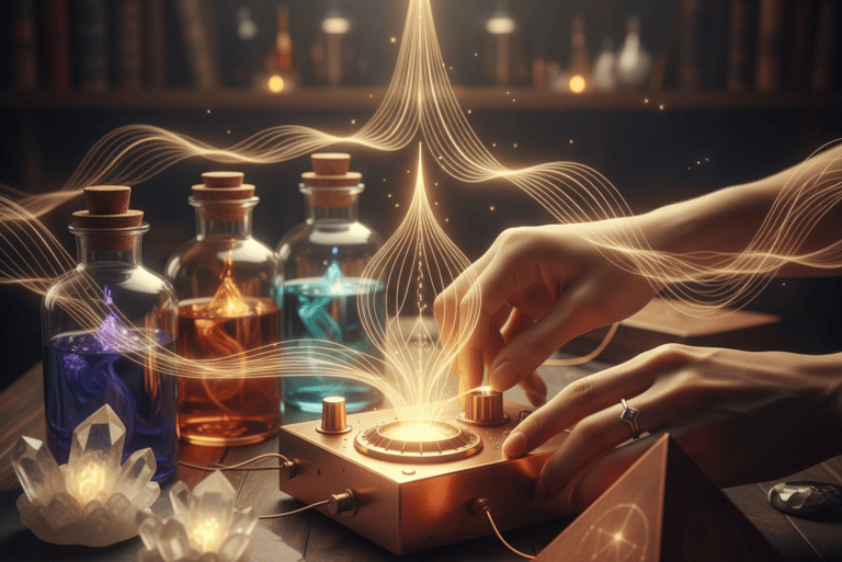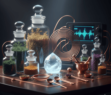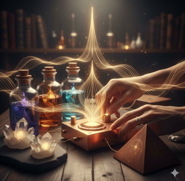 "El toque final es la intención activa. Usando generadores de frecuencia, infundimos cada producto con una vibración sónica específica (Onda Sinusoidal pura). Cada artefacto es sintonizado como un instrumento para resonar con un propósito: calma, enfoque y sanación."
